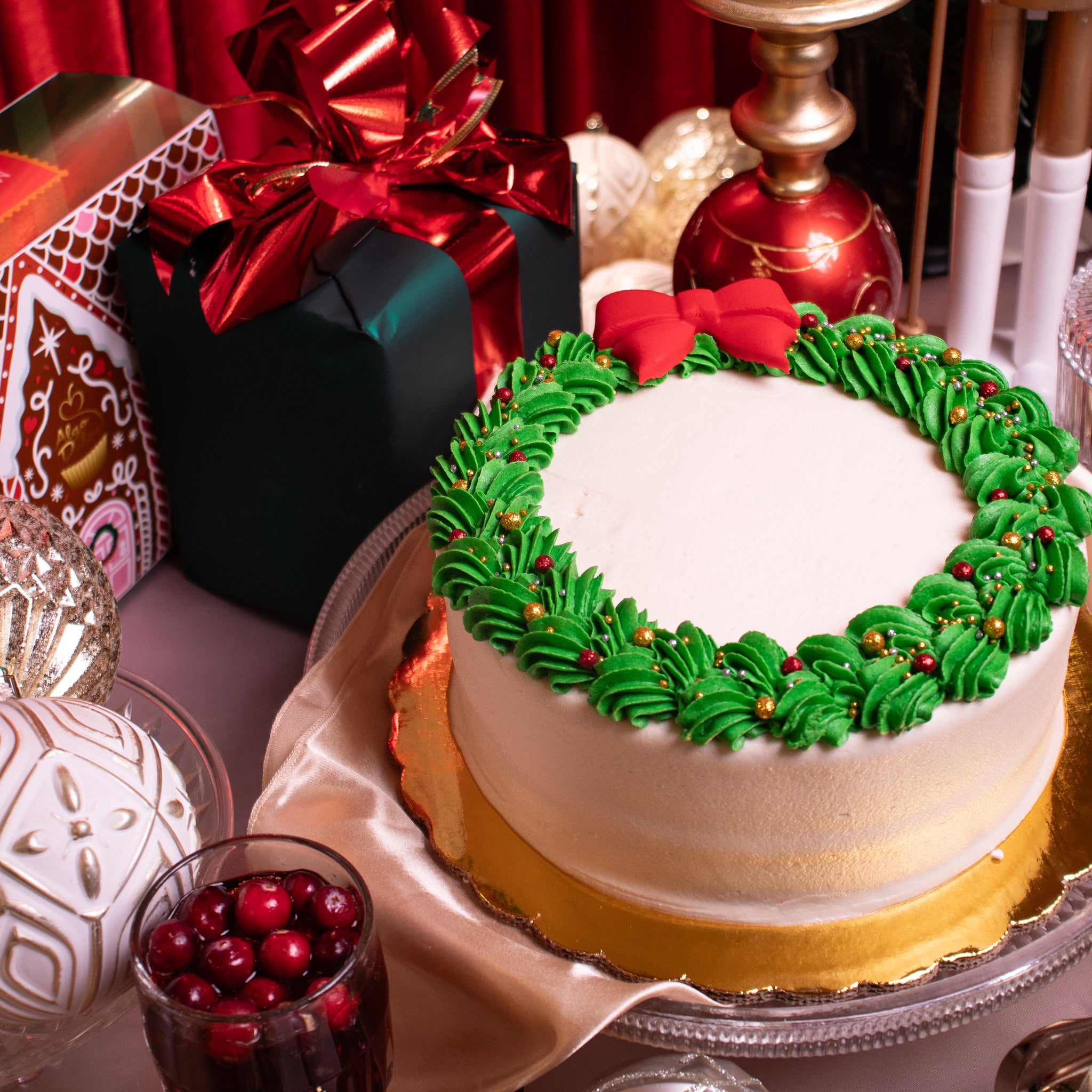 Suave pan de vainilla con relleno de dulce de leche y cobertura de betún de mantequilla. Decorado con una corona verde y un lazo rojo de betúnque llenan la mesa de espíritu navideño.