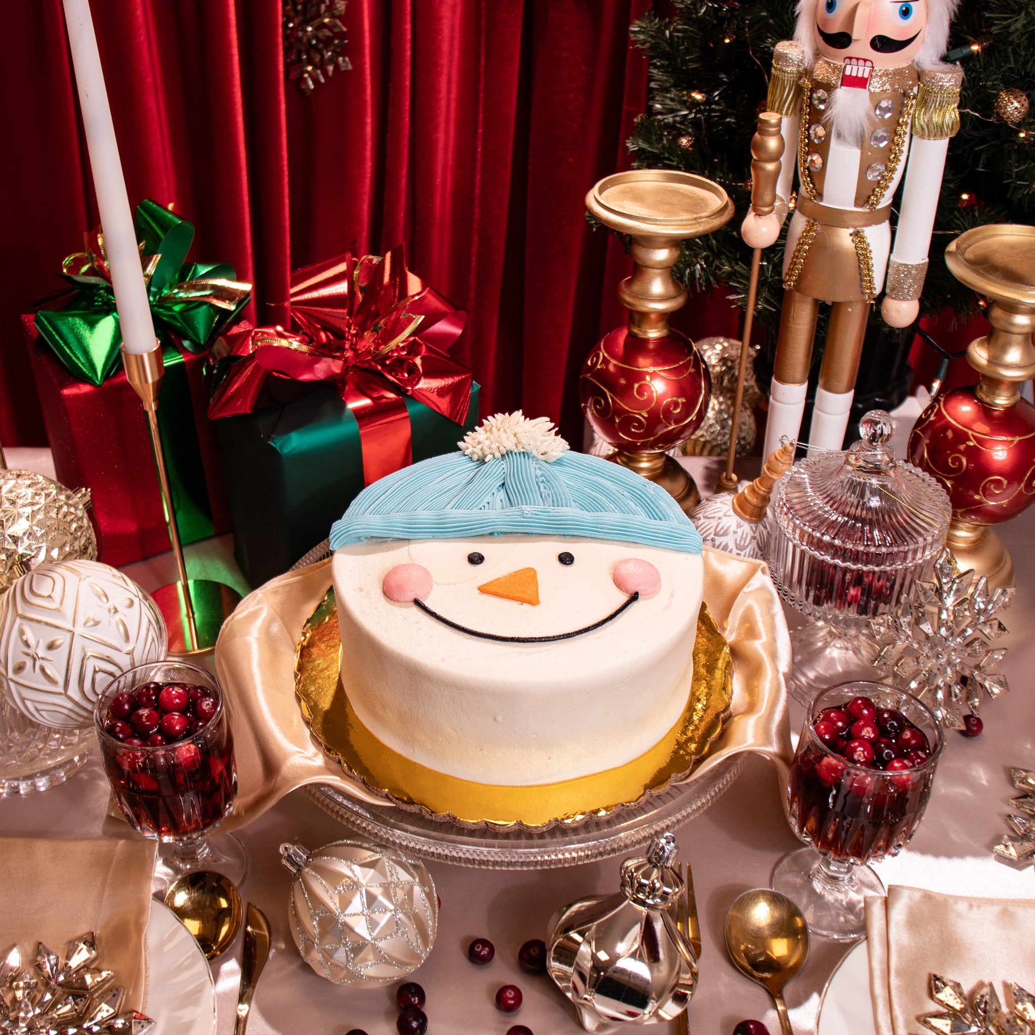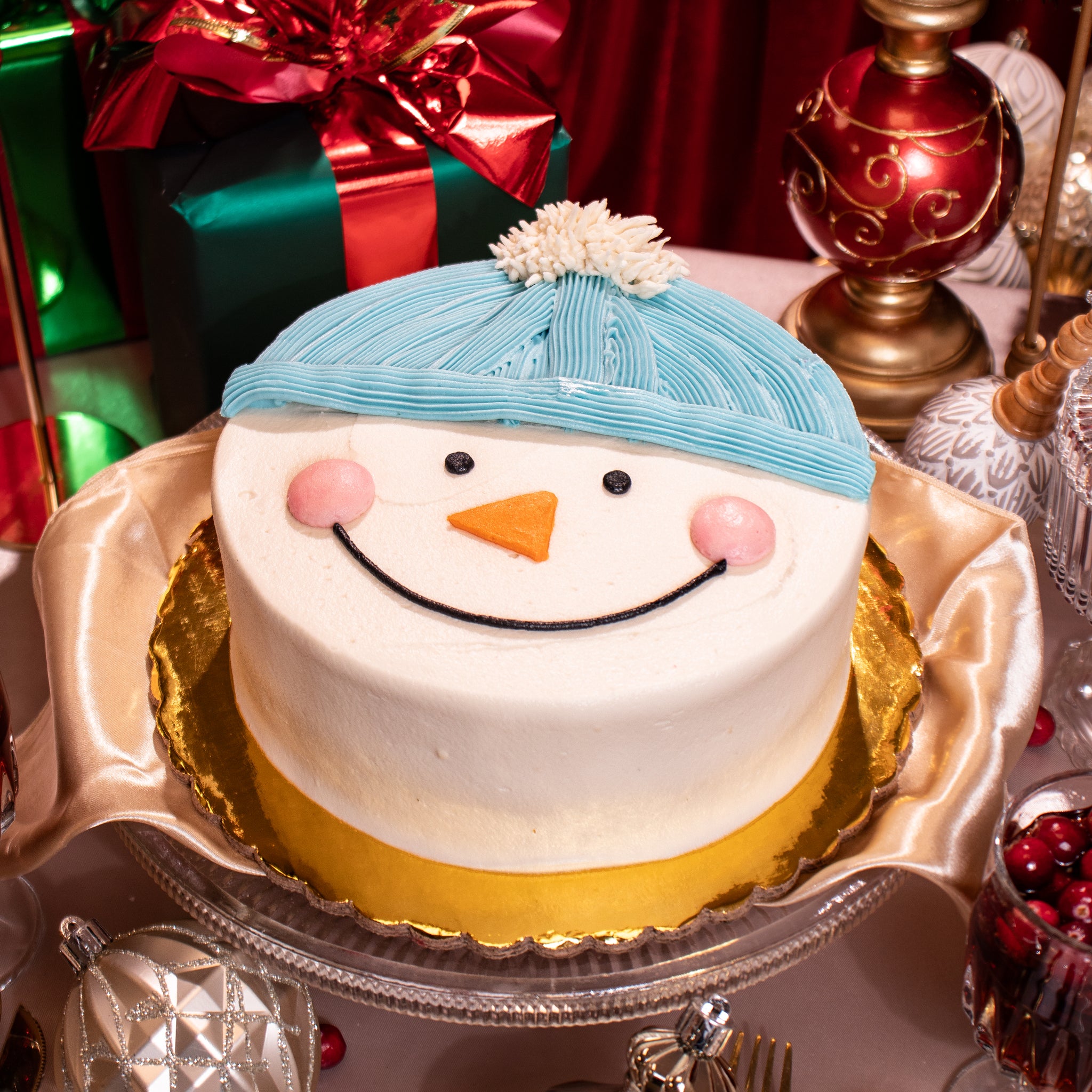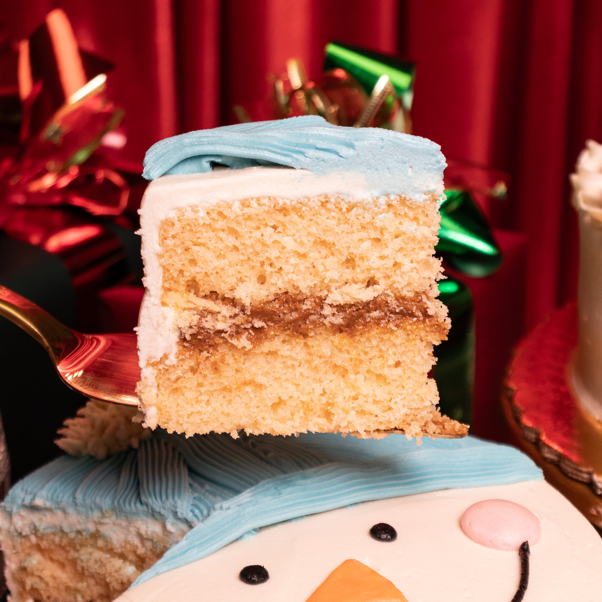 Esponjoso pan de vainilla con relleno de dulce de leche y cobertura de betún de mantequilla. Decorado con una tierna carita de muñeco de nieve que llena de alegría cualquier celebración invernal.