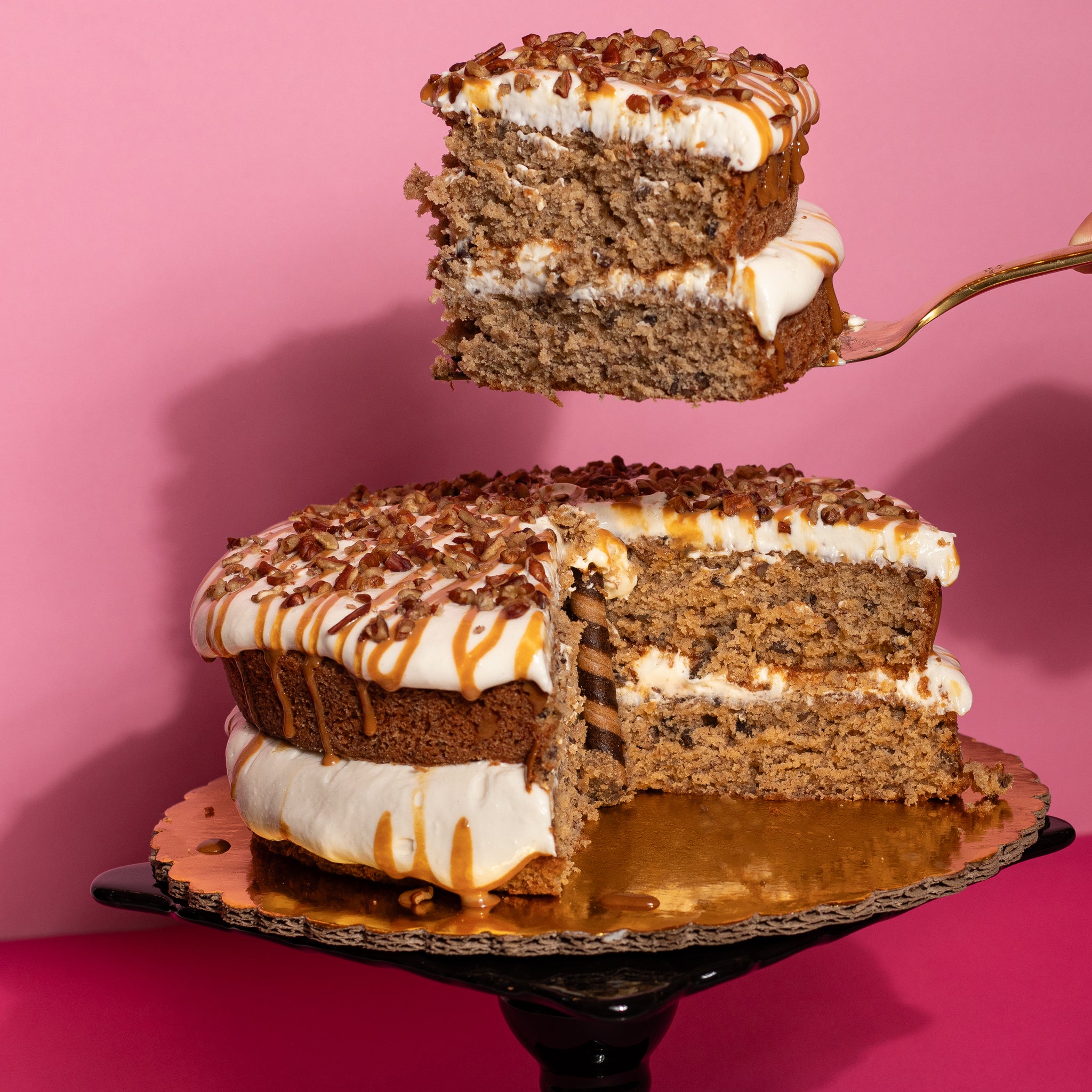 Pan de plátano con dulce de leche, cubierto con topping de queso cremoso, dulce de leche y un toque crocante de nuez
